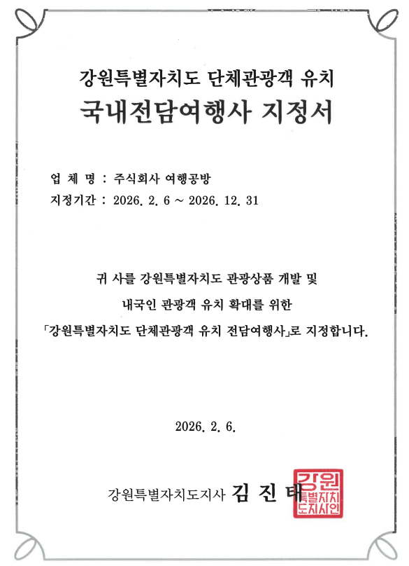 ÀúÈñ ¿©Çà°ø¹æÀº 2026³â °¿øµµ ±¹³» Àü´ã¿©Çà»ç·Î ¼±Á¤µÊ¿¡ µû¶ó